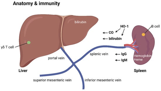 The immune activation and tolerance mechanisms in the liver and spleen. The spleen is responsible for generating B cell antibodies, including IgG and IgM, and the liver is responsible for generating gamma/delta T cells with clonal anergy. Heme production from hemoglobin inside the spleen provides an immune activation environment in the spleen. The spleen HO-1 enzyme generates CO and bilirubin transported via the splenic vein to the liver to help immune tolerance in the liver.