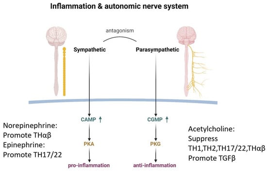 Ultimately, the sympathetic nerve system, with its pro-inflammatory “fear or fight” response, and the parasympathetic nerve system, with its anti-inflammatory “rest and digest” response, strike a delicate harmony, regulating the body’s inflammatory response with the precision of a finely tuned orchestra. The relationship between immune regulation and the autonomic nerve system is shown in Figure 2.