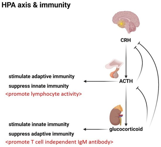 While CRH, ACTH, and glucocorticosteroids form the core ensemble of the HPA axis, the performance is enriched by the contributions of other cytokines. CRH can induce innate immunity through the upregulation of pro-inflammatory cytokines, a stirring prelude that sets the stage for the ensuing immune response [72,73,74,75].