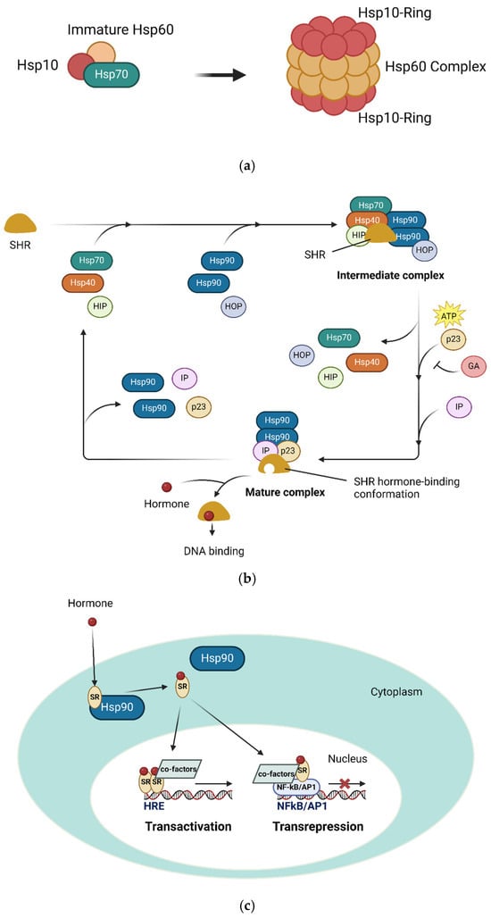 The heat shock proteins’ influence extends beyond mere chaperoning, assuming a strategic role in regulating the body’s hormonal defenses. HSP90, once activated, binds to steroid receptors, preventing their interaction with glucocorticosteroids and their subsequent binding to target DNA. Before the formation of the mature HSP90 and steroid receptor complex, HSP70 and HSP40 assist in forming an immature complex that promotes the final formation of the mature complex [77] (Figure 4b,c). This effectively short-circuits the suppressive effects of steroid signaling on adaptive immunity, allowing the body’s defensive forces to mount an unencumbered response.