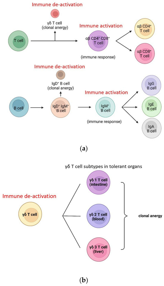 (a) Gamma/delta T cells and IgD B cells; (b) classification of gamma/delta T cells. The immune deactivation is related to the clonal anergy of gamma/delta T cells and to the clonal anergy of IgD B cells. The immune activation is related to the IgM B cells and subsequent IgG/IgE/IgA B cells and to the alpha/beta T cells. Gamma/delta T cells have three subtypes that exist in the intestine, blood, and liver to mediate immune tolerance.