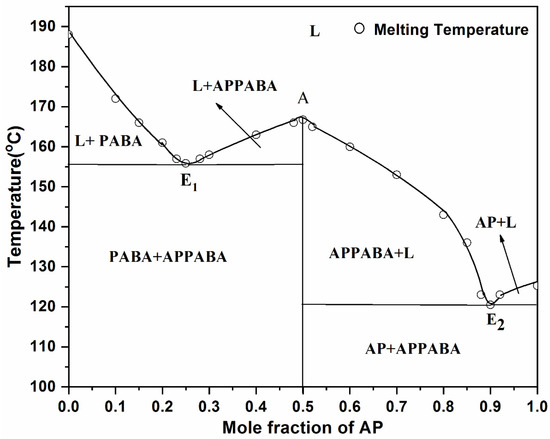 The phase diagrams represent the melting temperature–composition curve [47]. To establish the phase diagram of the AP—PABA binary system, the mixtures of the AP and PABA compounds from 0 to 1 mole fractions were prepared by weighing their appropriate amount using the physical balance (Denver SI-234, Denver Instrument Company, Denver, CO, USA) of accuracy ± 0.0001 g. These mixtures were placed in different dried test tubes, and the mouth of each test tube was sealed. Then, each sealed test tube was placed individually in a pre-heated silicon oil bath, and the mixtures were melted and homogenized by repeating the process of melting/mixing, followed by chilling in ice-cold water 4 times. The test tube, containing the homogenized mixture, was broken, and the solid mixture was ground using a mortar and pestle, and the melting point of each compositional mixture was recorded using the Toshniwal melting point apparatus, equipped with a thermometer, which can read measurements with an accuracy of 0.5 degrees Celsius. The melting points of IMC and eutectics were further confirmed by differential scanning calorimeters. The phase diagram of PA—PABA was plotted by taking the mole fractions of PA on the X-axis and their corresponding melting temperatures on the Y-axes.
