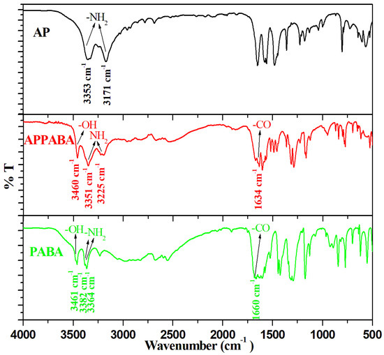 FTIR spectra of AP, PABA and the APPABA compound.