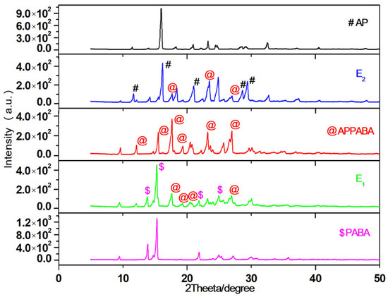 PXRD patterns of AP, PABA, eutectics (E1 and E2), and the APPABA intermolecular compound.