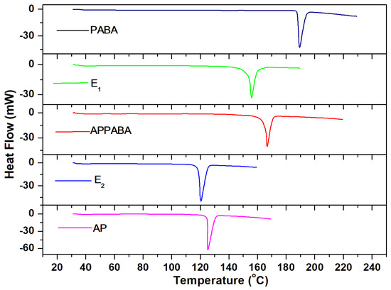 DSC thermogram of AP, PABA, eutectics (E1 and E2), and the APPABA compound.