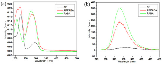 (a) UV–vis absorption and (b) emission spectra of AP, PABA, and the intermolecular compound APPABA.