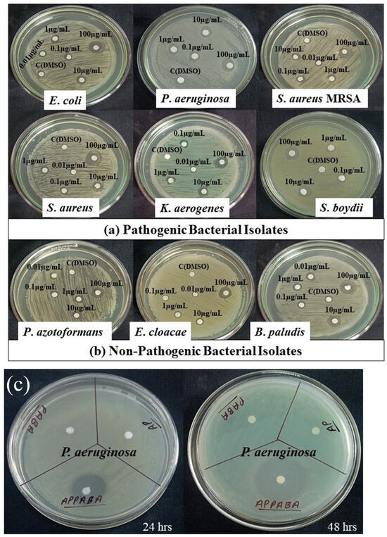 Compared to antibiotics the minimum inhibitory concentration (MIC) of APPABA measured through the disc diffusion method was 0.1 µg/mL for all the selected bacterial strains. Among the various pathogenic bacterial isolates tested, the inhibition zone formed by APPABA was maximum against P. aeruginosa (9.75 mm), followed by S. aureus (8.75 mm), E. coli (8.25 mm), the methicillin-resistant bacterial strain viz. S. aureus MRSA (8.25 mm), K. aerogenes (8.25 mm), and S. boydii (6.75 mm). These results are shown in Figure 12 and Figure 13, with the minimum inhibitory concentration (MIC) being 0.1 µg/mL. The compound APPABA also exhibited good antibacterial activity against the non-pathogenic bacterial isolates, showing a maximum zone of inhibition around B. paludis (8.75 mm), followed by P. azotoformans (5.25 mm) and E. cloacae (4.0 mm), with the minimum inhibitory concentration (MIC) being 0.1 µg/mL. The parent compounds, AP and PABA, screened for antibacterial activity, showed negative results, as no inhibition zone was observed against the tested bacterium Pseudomonas aeruginosa, as shown in Figures S8 and S9 in the Supplementary Information. Even after increasing the incubation period from 24 to 48 h, no considerable zone of inhibition was observed against the bacterial lawn for the parent compounds. At the same time, the zone of inhibition formed by the synthesized compound APPABA increased from 14 mm to 25 mm after extending the incubation period from 24 h to 48 h, as depicted in Figure 12c.