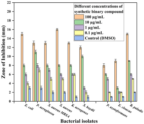 Bar graph showing the zone of inhibition formed by the synthesized binary compound (APPABA) against several pathogenic and non-pathogenic bacterial isolates to determine the minimum inhibitory concentration (MIC) using the disc diffusion method. The means of three replicates were used to compare treatments using Tukey’s multiple range test at p ≤ 0.05; the slanting bars indicate the standard error of the mean.
