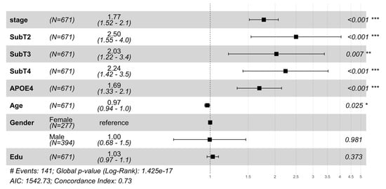 MCI-to-AD progression risk was analyzed using a Cox proportional hazards model in the validation cohort (671/808 MCI subjects with follow-up data), shown in Figure 1. The model incorporating s-SuStaIn measures (stage and subtype) achieved a concordance index (C-index) of 0.73 and AIC of 1542.73, outperforming traditional models based on demographics and genetics (C-index = 0.62, AIC = 1604.39).