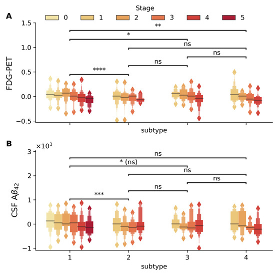Distribution of FDG-PET (standard uptake value) and CSF Aβ42 (pg/mL) biomarkers across disease stages and subtypes. Box plots display the stage-wise progression (stages 0–5, shown in color gradient from light to dark) within each subtype. (A) FDG-PET and (B) CSF Aβ42 within each subtype (1–4). Statistical significance of between-subtype comparisons is indicated by horizontal bars (* p < 5 × 10−2, ** p < 5 × 10−3, *** p < 5 × 10−4, **** p < 5 × 10−5, ns: not significant). FDG-PET metabolism shows significant differences between Subtypes 1 and 2, 1 and 3, and 1 and 4, with significant stage-wise decline in Subtypes 1 (βstage = −0.021 p = 7.6 × 10−7), 3 (βstage = −0.035, p = 1.2 × 10−3), and 4 (βstage = −0.044, p = 7.9 × 10−5). CSF Aβ42 levels demonstrate significant variation between Subtypes 1 and 2, with progressive stage-wise reduction particularly evident in Subtypes 1 (βstage = −46.34, p = 9.3 × 10−4) and 4 (βstage = −88.18, p = 8.2 × 10−3). All analyses were adjusted for age, gender, education, and APOE4 status, with between-subtype comparisons additionally adjusted for disease stage.