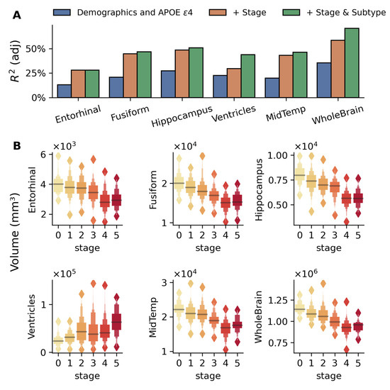 Structural MRI analysis using sequential nested regression models (Figure 3A) demonstrated increasing explanatory power across brain regions. The base model with demographics and APOE ε4 alone explained 13–35% variance in brain regional volumes, with stage inclusion improving adj. R2 to 30–60%, and subtype addition further increasing adj. R2 for whole-brain (70%) and ventricular volumes (44%). These volumetric changes were significant across disease stages in key AD-related regions (p < 10−28, for all regions shown in Figure 3), controlling for demographics, APOE4, and subtypes (Figure 3B). These results suggest that the progressive brain volumetric changes across AD are best explained when considering both disease stage and subtypes.