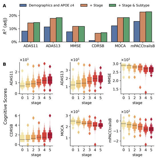 Cognitive and clinical measures (e.g., Alzheimer’s Disease Assessment Scales (ADAS11, ADAS13) and Clinical Dementia Rating–Sum of Boxes (CDR-SB)) showed significant associations with disease stage (Figure 4). Adding the stage improved model R2 substantially (e.g., ADAS13: 11.3% to 18.4%, Figure 4A). ADAS scores distinguished early stages (e.g., stage 0 vs. 1, * p < 0.05), while MMSE and mPACCtrailsB differentiated advanced stages (** p < 5 × 10−4), as shown in Figure S4.