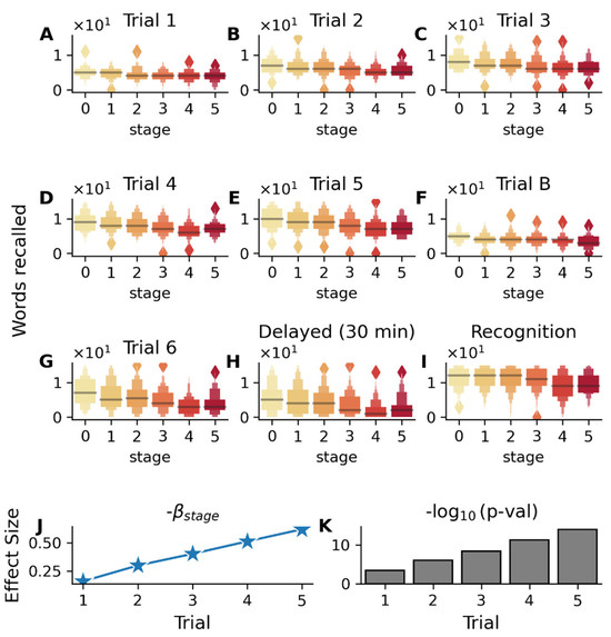 Association between RAVLT (Rey Auditory Verbal Learning Test) performance and disease stages in the validation cohort (MCI subjects). Color gradient from light to dark in (A–I) represents increasing disease stages. (A–E) Box plots showing the distribution of scores (number of words recalled in each trial) across disease stages (0–5) for immediate recall trials (1–5), (F) interference list (Trial B), (G) post-interference recall (Trial 6), (H) delayed recall (30 min), and (I) recognition memory. The association between test scores and s-SuStaIn inferred disease stages is adjusted for age, gender, education, APOE ε4 status, and disease subtypes. (J) Analysis of learning Trials 1–5 showing increasing magnitude of βstage coefficients and (K) strengthening statistical significance (−log10(p-value)) across successive learning trials 1-5, indicating that subjects in earlier disease stages become better at recall with increasing trials, while subjects in the later stages do not improve as much. Significant association with disease stage is also seen for the interference list (Trial B, βstage = −0.215, p = 7.7 × 10−6), post-interference recall (Trial 6, βstage = −0.82, p = 4.8 × 10−16), 30 min delayed recall (βstage = −0.80, p = 3.18 × 10−14), and recognition memory trial (βstage = −0.53, p = 1.6 × 10−7).