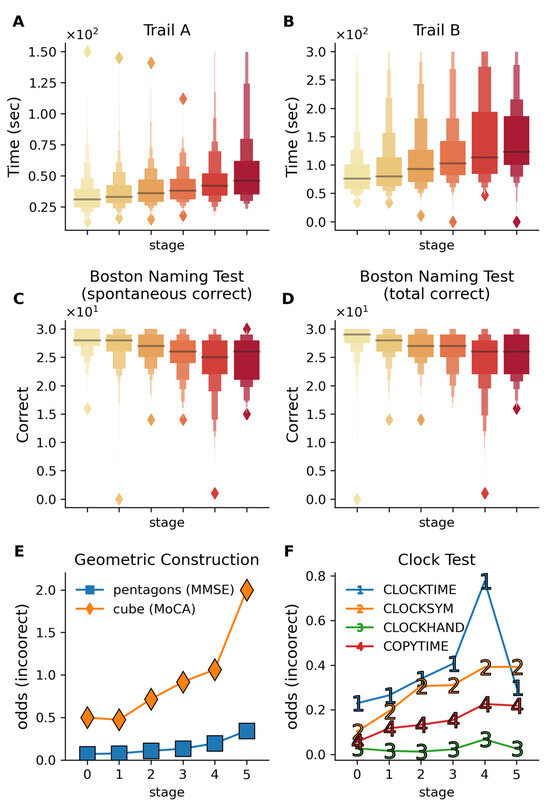 Cognitive performance across multiple visuospatial and executive function tests across disease stages. Color gradient from light to dark in (A–D) represents increasing disease stages. (A,B) Trail making test completion times for Trails A and B show progressive slowing in completion time with advancing stages. Trail B (βstage = 10.57, p = 2.0 × 10−8) shows a stronger decline with disease stage compared to Trail A (βstage = 2.98, p = 9.9 × 10−8), reflecting the additional cognitive burden in the Trail B test, which requires the subjects to alternatively switch between letters and numbers. These results reflect the deteriorating visual attention, processing speed, and cognitive flexibility with increasing disease stage. (C,D) The Boston Naming Test demonstrates a decline in visual recognition and confrontational naming ability, with both spontaneous (p = 3.5 × 10−7) and total correct responses (p = 3.3 × 10−7) declining with disease stage. (E) The odds of incorrect performance on geometric construction tasks increase with disease stages (evaluated via cube drawing on MoCA and pentagon drawing on MMSE). (F) Odds of incorrect responses on the clock drawing components increase with disease stages, indicating progressive impairment in visuospatial processing and motor planning. CLOCKTIME—correct times drawn; CLOCKSYM—clock numbers are symmetrically placed; CLOCKHAND—presence of two hands; COPYTIME—correct time shown in the copy condition of the test. All analyses are adjusted for age, gender, education, APOE ε4 alleles, and subtypes.