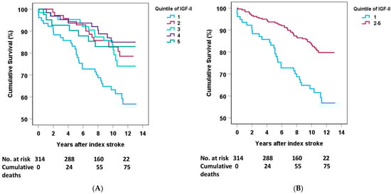 S-IGF-II in the acute phase after stroke among males and its association with overall poststroke mortality. Low IGF-II in the acute phase after ischemic stroke is associated with an increased risk of overall mortality. (A) Shows the individual quintiles (for the legend, see the inset), while Figure 1B compares the lowest with the 2nd–5th merged into one group. The lowest quintile is marked with light blue in both figures; in (B), the merged group is marked with purple. Log-rank test in (A): p = 0.006 quintile 1 vs. 2, p = 0.022 quintile 1 vs. 3, p = 0.001 quintile 1 vs. 4, p = 0.018 quintile 1 vs. 5. Log-rank test for overall comparison in (A): p < 0.001; in (B): p < 0.001. Numbers at risk are presented as after the year of index stroke (4, 8, and 12 years post-stroke).