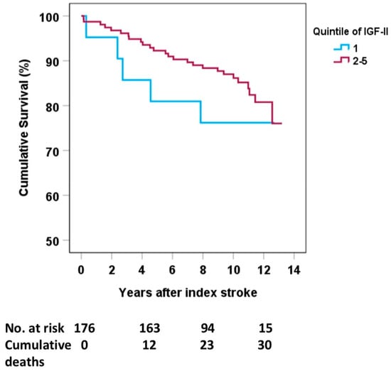 The effect of low s-IGF-II in males was more robust for mortality, and it withstood all adjustment models. Although controversial, this may have a link to reports of associations between s-IGF-II and cancer mortality. Indeed, high s-IGF-II has been reported to be correlated with cancer risk, especially colorectal, breast, prostate, lung, and colon cancer [], and low s-IGF-II has been correlated with colorectal cancer mortality []. Our mortality data were retrieved and calculated based on any cause of mortality, and we did not have full access regarding the specific cause of death, which limited the conclusions that we could draw from our mortality data. Since malignancy is the second-most common cause of death in Sweden, this might have affected our results regarding mortality. However, this is probably of minor concern in the present study, which is mostly because death due to CVD is the predominant cause of death after stroke [].