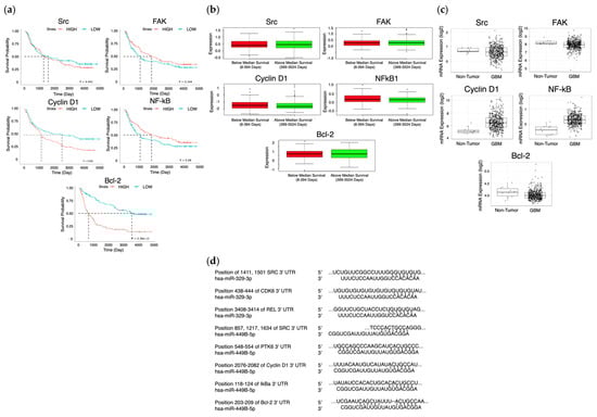 Dysregulation of NF- kB signaling can promote oncogenesis via the inhibition of antitumor immune responses, and can transcriptionally activate the Bcl-2 family [10]. Specific cell survival pathways in cancers become activated to promote cell survival, such as the FAK/Src pathway, which is closely involved in cell cycle progression and proliferation in that FAK signaling can lead to increased cyclin D1 expression, a key regulator of the G1 to S phase transition [11]. Src and NF-kB have been repeatedly implicated as poor prognostic factors in many cancers, including triple negative breast cancer, and we found that their upregulation has been shown to decrease patient survival in GBM (Figure 1a,b) [12]. This data correlates with increased oncogenic activity of these proteins in GBM patient cells in comparison to healthy brain tissue, where oncogenic proteins are relevant targets for miR treatment (Figure 1c). In oncogenic proteins which do not appear to demonstrate decreased survival or differential expression in GBM versus healthy tissues, it is pertinent to understand and elucidate the impact of phosphorylated protein activity on each.