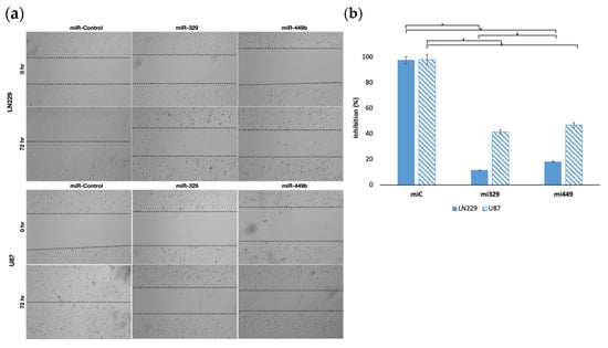 Based on our findings we decided to first investigate the ability of the selected miRs to target motility regulating proteins with differential survival and expression in GBM patients. We hypothesized that miR-329 and miR-449 would be able to inhibit the motility, and therefore migration capacity, of the LN229 and U87 cell lines in a wound healing assay, due to the rescue of miR-329 and miR-449b expression (Figure 2a). To define this effect, we assessed wound healing in both cell lines when transiently transfected with control miRNA, miR-329 or miR-449. MiR-329 and miR-449b expression significantly impaired GBM cell migration compared to the control condition. In LN229 cells, miR-329 transfection resulted in an 88.3% reduction in wound closure, while miR-449b reduced migration by 81.5% relative to the control (Figure 2b) (p < 0.05). Similarly, in U87 cells, miR-329 and miR-449b treatments led to a 57.9% and 52.2% decrease in migration capacity, respectively, compared to the control (p < 0.05). Notably, LN229 cells exhibited a more pronounced reduction in migration upon miRNA treatment than U87 cells, suggesting potential cell line-specific differences.