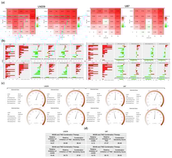 Optimization of TMZ and miR combinations for LN229 and U87 spheroid treatment. TMZ was diluted at a 1:2 ratio from 300 µM, and miR-329 and mi-449 were diluted at a 1:2 ratio from 100 nM. U87 and LN229 cells were cultured in monolayer until confluent and transfected with miR-329 or miR-449b at a specific dilution. After 3 days they were collected and seeded in low adhesion u-bottom plates to form spheroids for 3 days. Spheroids were then treated with TMZ at a specific dilution for 48 h and then a luminescent reagent was applied to determine inhibition percentage (a) for each drug combination by normalizing to the control and subtracting the determined cell viability from 100%. ZIP, BLISS, HSA, and LOEWE synergy models (b) were applied to the matrix of inhibition percentages for each cell line and TMZ-miR drug combination. Individual combinations with the highest synergy scores (c) were identified and overall drug pair sensitivity (d) determined. Data represent the mean ± SD of three biological replicates.