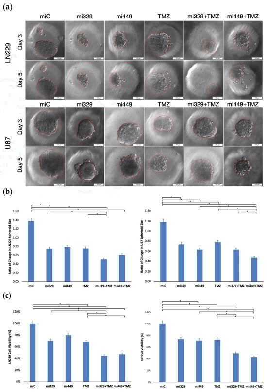 To analyze the effects of the determined synergistic concentrations of miR-329 or miR-449b and TMZ, LN229 or U87 cells were transfected at 100 nM and then cultured in 3D PEGDA microwell chips, as seen in Figure 4a. After three days of spheroid formation, TMZ was applied to the microwells (300 µM) and the spheroids were left to incubate for two more days. Spheroids were evaluated for changes in area with ImageJ using images taken at day three of spheroid formation before treatment and at day five (Figure 4b). In the LN229 cell line, the miR-Control treatment generated a 38% increase (1.38 ratio) in spheroid area (p < 0.05). Treatment with miR-329 and miR-449b alone decreased spheroid area to 75% and 78% of initial size, respectively (p < 0.05). TMZ alone induced a reduction to 75% of initial spheroid area (p < 0.05). Combination therapies miR-329 with TMZ, and miR-449b with TMZ, resulted in a reduction to 50% and 61% of initial spheroid size, respectively, with both treatments being significantly reduced versus the control (p < 0.05). In the U87 cell line, the miR-Control treatment resulted in a 19% increase in spheroid size (p < 0.05). Treatment with miR-329 retained 73% of initial size and miR-449b retained 63% of initial size (p < 0.05). TMZ alone demonstrated the least inhibition of spheroid growth in that TMZ spheroids remained at 78% of initial size. Combination treatments miR-329 with TMZ at 63% of initial area and miR-449b with TMZ at 47% of initial area, resulted in the most significant reduction in spheroid size (p < 0.05). It can also be observed that spheroids treated with miRs by day 3 after seeding, are malformed. Visually, the spheroids demonstrate characteristics that imply a decreased ability to create tight cell-to-cell interactions, resulting in a less defined boundary.
