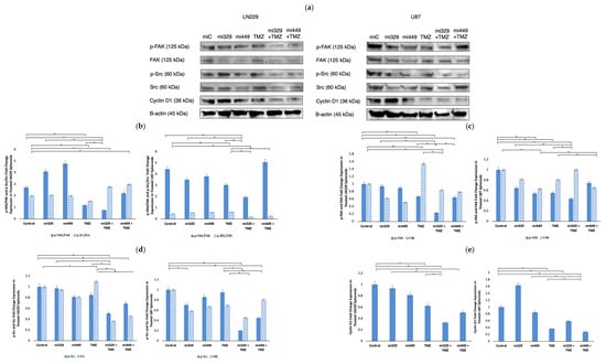 To further confirm whether the Src/FAK signaling pathway was downregulated by the combination of miR-329 or miR-449b and TMZ, the expression of Cyclin D1, p-FAK, FAK, p-Src, and Src, which regulate cell cycle progression and adhesion, were investigated. Cyclin D1, which is a key regulator of the G1-to-S phase transition [33], was significantly downregulated in co-treated groups. In LN229 spheroids, Cyclin D1 expression was reduced to 0.33 in the miR-329 with TMZ treatment group and 0.50 in the miR-449b with TMZ treatment group compared to the control treatment (p < 0.05) (Figure 5e). In U87 spheroids, Cyclin D1 levels were 0.59 in miR-329 with TMZ treatment groups and 0.28 in miR-449b with TMZ treatment groups (p < 0.05).