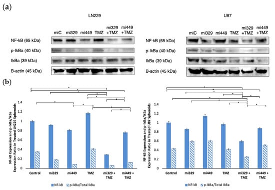 We also analyzed the p-IkBα/Total IkBα expression ratio as a measure of NF-κB signaling activation (Figure 6b). For all treatments and both cell lines, p-IkBα and total IkBα expression was normalized to the miR-Control treatment expression. In LN229 spheroids, treatment with control miR, miR-329, and miR-449b alone led to ratios of 0.35, 0.18, and 0.09, respectively. TMZ alone resulted in a ratio of 0.41, while miR-329 with TMZ and miR-449b with TMZ co-treatments further decreased the ratio to 0.06 and 0.13, respectively (p < 0.05). In U87 spheroids, treatment with control miR, miR-329 and miR-449b alone led to ratios of 0.43, 0.59, and 0.61, respectively. TMZ treatment alone resulted in a ratio of 0.42, while miR-329 with TMZ and miR-449b with TMZ co-treatments led to reductions to 0.25 and 0.51, respectively (p < 0.05). These findings suggest that the synergistic combinations of miR-329 or mirR-449b and TMZ offer a potential therapeutic strategy to modulate NF-κB activity in glioblastoma and, therefore, therapeutic resistance.
