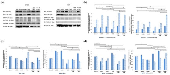 To probe whether apoptosis signaling was induced by co-treatment, we assessed the expression of intrinsic and extrinsic apoptotic markers, including Bax, Bcl-2, PARP, and cleaved PARP, in U87 and LN229 GBM spheroids. The Bax/Bcl-2 ratio serves as a crucial indicator of intrinsic apoptotic susceptibility, as well as of the balance of PARP and its cleavage. Please note that loading controls were used for each western blot experiment, but only the representative loading control was displayed (Figure 7a). In LN229 spheroids, the control group had a baseline Bax/Bcl-2 ratio of 0.83, while treatment with miR-329 and miR-449b alone resulted in ratios of 0.80 and 0.94, respectively (Figure 7b). TMZ alone led to a decrease in the ratio to 0.52, whereas miR-329 with TMZ and miR-449b with TMZ co-treatments increased the ratio to 1.01 and 1.07, respectively (p < 0.05). In U87 spheroids, the Bax/Bcl-2 ratio was 0.65 in the control group, 0.71 with miR-329 and 1.17 with miR-449b (p < 0.05). TMZ alone reduced the ratio to 0.38, while the combination treatments of miR-329 with TMZ and miR-449b with TMZ resulted in ratios of 0.71 and 1.39, respectively. Upon analyzing Bcl-2 expression alone in the miR-329 with TMZ and miR-449b with TMZ co-treatments, in both spheroid cell line models were down regulated, to 0.44 and 0.69 respectively, compared to the control and single-drug treatments (p < 0.05) (Figure 7c). Bax expression was relatively unchanged in LN229 across treatments. However, in U87, Bax expression was increased in the miR-329 to 1.72 and in miR-449b to 1.72, with a moderate increase observed in miR-449b with TMZ to 1.47 (p < 0.05).