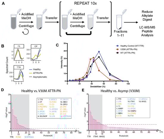 To establish the proteomic profiles for each experimental group, we analyzed plasma samples from 12 untreated V30M ATTRv-PN patients, 8 asymptomatic V30M carriers, and 4 healthy (WT TTR only) controls; patient samples were chosen at random from our biobank []. Plasma was subjected to DiffPOP fractionation by sequential addition of an increasingly concentrated aqueous denaturing acidic methanol solution (Figure 1A).