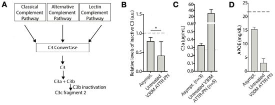 (A) Scheme of complement pathways described in this study, which all converge on C3 conversion. (B) Quantification of the band corresponding to intact (inactive) C3. The dashed line represents C3 band intensity of the control loaded in each gel. The asterisk (*) indicates significance (p-value = 0.05). (C) Quantification of plasma C3a levels using a commercially available ELISA. A total of 13/18 untreated V30M ATTRv-PN patients analyzed (not included in the graph) had C3a values above the upper detection limit of the ELISA (>48 µg/mL). The dashed line represents C3a levels in one healthy control. (D) Plasma APOE levels by commercially available ELISA in 3 asymptomatic V30M carriers and 18 untreated V30M ATTRv-PN patients. The dashed line represents plasma APOE levels in one healthy control.