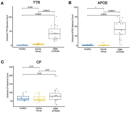 (A) Spectral counts of oxidized TTR in the healthy control, asymptomatic V30M carriers, and V30M ATTRv-PN patient plasma. (B) Spectral counts of oxidized APOE in the healthy control, asymptomatic V30M carriers, and V30M ATTRv-PN patient plasma. (C) Spectral counts of oxidized CP in the healthy control, asymptomatic V30M carriers, and V30M ATTRv-PN patient plasma.