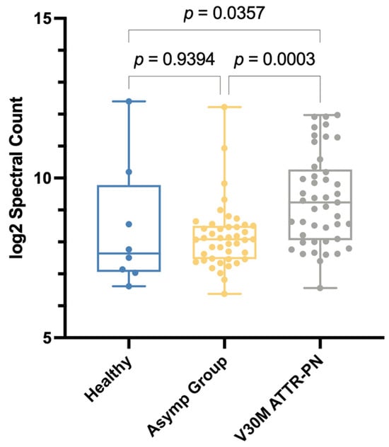Spectral counts of peptides that remain soluble after DiffPOP fractionation in healthy control plasma (n = 8), asymptomatic V30M carrier plasma (n = 43), and untreated V30M ATTRv-PN patient plasma (n = 45). Statistical analysis was performed using the Kruskal–Wallis test with the Benjamini–Hochberg correction.