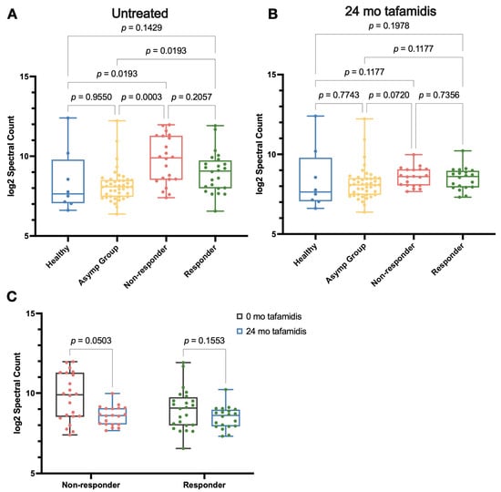 (A) Spectral counts of peptides that remain soluble after DiffPOP fractionation in the healthy control (n = 8), asymptomatic V30M carriers (n = 43), and untreated V30M ATTRv-PN patient plasma (non-responder: n = 22 and responder: n = 24). Statistical analysis was performed using the Kruskal–Wallis test with the Benjamini–Hochberg correction. (B) Spectral counts in the healthy control (n = 8), asymptomatic V30M carriers (n = 43), and V30M ATTRv-PN patient plasma (non-responder: n = 20 and responder: n = 20) following 24 months of tafamidis treatment. Note that the data for the “Healthy” and “Asymp Group” are the same in panels (A,B). (C) Comparison of spectral counts in V30M ATTRv-PN patient plasma from panel (A,B) before (non-responder: n = 22 and responder: n = 24) and after 24 months of treatment with tafamidis (non-responder: n = 20 and responder: n = 20). Note that the data in panel (C) are replotted from panels (A,B) for easier comparison. Statistical analysis was performed using the Mann–Whitney test with the Benjamini–Hochberg correction.