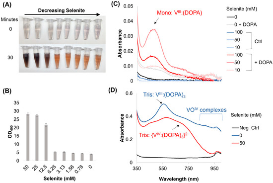 Melanin formation and UV-Vis spectra of vanadium–DOPA mixtures upon the addition of selenite. (A,B) Melanin is formed, without the enzyme, using 100 μM vanadate and 3 mM L-DOPA upon the addition of selenite. Values in (B) are measured after ~16 h. (C) UV-Vis spectrum scans of various reaction conditions upon the addition of 15 mM DOPA to 100 μM vanadate or (D) 1 mM vanadate with varying concentrations of selenite. The negative control (Neg Ctrl) = acetate buffer without any additives.