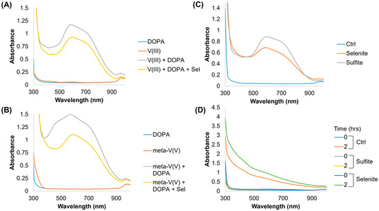 UV-Vis scans of alternative vanadium and thiol-like compounds. UV-Vis scans from 300 nm to 1000 nm for (A) 1 mM vanadium chloride (V(III)) and (B) 1 mM ammonium metavanadate (meta-V(V)) with 15 mM DOPA. (C) UV-Vis spectrum of 1 mM vanadate and 15 mM DOPA in the presence of 100 mM selenite or sulfite. (D) UV-Vis spectrum of 100 μM vanadate with 15 mM DOPA at 0 h and 2 h of incubation at 37 °C with 100 mM selenite or sulfite.