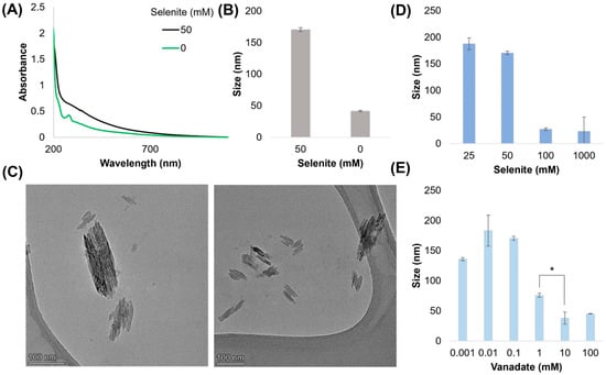 Morphological characterization. (A) Absorption spectra of purified and resuspended melanin produced with/without selenite. (B) DLS measurement of melanin samples with/without selenite. Melanin particles were not purified via acid–base cycling. (C) TEM images of nano-rods found in solution prior to purification. The long axis of the particles corresponded with DLS measurements. (D,E) DLS measurements (volume result) of nano-rod size when altering selenite or vanadate concentrations. * = significant difference (α ≤ 0.05).