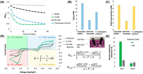In order to further quantify the redox properties of these melanin variants, we created chitosan films with suspended melanin particles and subjected them to reverse electrochemical probing [10]. This method is semi-quantitative and calculates “excess electron” exchange relative to an inert control (i.e., an empty chitosan film). In this technique, two redox shuttling mediators are used (ferrocene dimethanol (Fc) and phenazine-1-carboxylic acid (PCA)) to pass electrons between melanin and the electrode during a voltage sweep. The charge accumulated from each mediator is then calculated using integrals in each quadrant centered at 0 V (see quadrants and cyclic voltammograms in Figure 4D), before being used in the equations listed for calculating excess electrons passed to the higher-potential mediator FC (Nox) and to the lower-potential mediator PCA (Nred) (Figure 4E). We found that the melanin produced with vanadate alone passed nearly 6× more electrons to Fc per unit area of electrode compared to the melanin made with selenite. However, there was no significant difference in the electrons received from PCA for either variant. This indicated that both melanins are redox active, but selenite melanin has an attenuated oxidative capacity and therefore poorly interacts with reductants like PCA.