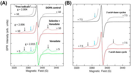 EPR characterization of reaction-purified melanin powders. (A) The EPR signatures of melanin powder made from DOPA (black; top), DOPA + selenite + vanadate (red; middle), and DOPA + vanadate (green; bottom). The magnification of the dotted lines is recorded next to each trace. The signature “free radical” signal’s corresponding g value is denoted above the top value, the small black arrows’ g value is labeled above the middle plot, and the small blue arrow’s g value is labeled above the bottom plot. (B) Comparison of EPR signatures from melanin made from DOPA + vanadate after three rounds of acid-base purification (top; black) or one round of purification (bottom; red).
