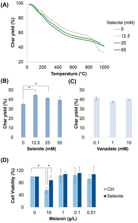 Thermogravimetric analysis and cellular toxicity of purified melanin variants. (A–C) Measurement of the thermal stability of purified melanin powders under a nitrogen atmosphere. Char yield is shown for melanin powder produced with various concentrations of selenite and vanadate. (D) HEK293 cell viability after a 2 h melanin treatment and 72 h recovery. * = significant difference (α ≤ 0.05).
