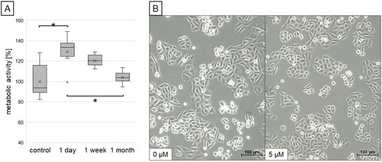 The influence of different incubation times with resveratrol on the mitochondrial metabolic activity of cardiomyocytes was measured using the XTT test (A). The relative activity is presented in relation to untreated controls (100%); statistically significant differences are marked with asterisks (p < 0.05). Morphology of control (0 µM) and resveratrol-treated (5 µM) cardiomyocytes observed under light microscopy (B).