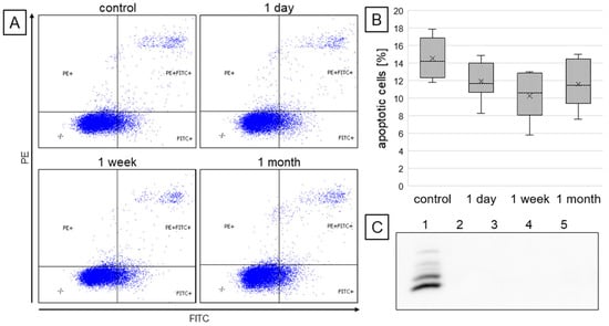 The influence of different incubation times with resveratrol on apoptosis of cardiomyocytes. Cells were stained with PI and anti-AnnexinV antibody, and analyzed by flow cytometry to estimate the number of apoptotic cells (PE and FITC-positive) (A,B). Activated caspase 3 was analyzed by Western blots using an antibody specific for the cleaved/activated form (C); lanes marked: 1—positive control (heat-induced apoptosis), 2—no resveratrol (control), 3—1 day, 4—1 week, 5—1 month of resveratrol treatment.