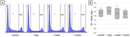 The potential effect of resveratrol on the distribution of cell cycle phases was assessed by flow cytometry-based analysis, and presented in Figure 4. This analysis revealed that exposure to resveratrol had no statistically significant effect on cell cycle arrest in either the G1 or G2/M phases, independently of exposure time. However, in the group treated for 1 day, a slight increase in the number of cells in the G1 phase was observed. The calculated G1:G2/M ratios in the studied groups were 2.3, 2.6, 2.3, and 2.2 for control, 1 day, 1 week, and 1 month of resveratrol treatment, respectively.