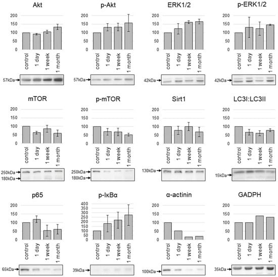 Additionally, the level of IκBα phosphorylation increased proportionally to the incubation time with resveratrol, which indicated the possible activation of NFκB-related pathways. On the other hand, reduced levels of p65 protein observed after prolonged incubation time (1 week and 1 month) could reflect adaptation of cells to this compound. Furthermore, observed changes in the proportion of different forms of LC3 protein, and an increased level of LC3-II form in cells exposed to resveratrol (irrespective of the incubation time) indicated activation of autophagy. Surprisingly, prolonged exposure of cells to resveratrol (1 week and 1 month) had a noticeable effect on the levels of proteins often used as loading controls—GAPDH (increase) and α-actinin (decrease). These changes putatively reflected resveratrol-induced changes in cellular metabolism and stressed out the importance of a proper selection of “neutral” protein as a loading control for Western blot analyses.