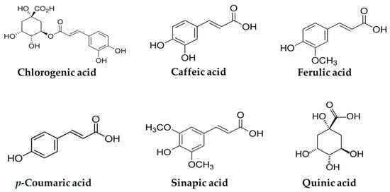 Chlorogenic acids are a family of polyphenolic compounds consisting of esters formed between hydroxycinnamic acids (caffeic, ferulic, p-coumaric, and sinapic acids) and quinic acid []. Among these, chlorogenic acid, an ester of caffeic and quinic acids, is the predominant form found in coffee. Figure 1 illustrates the chemical structures of chlorogenic, caffeic, ferulic, p-coumaric, sinapic, and quinic acids. The contents of chlorogenic acid and related hydroxycinnamic acids in coffee vary depending on the coffee species, roasting degree, and preparation method [], and are summarized in Table 2.