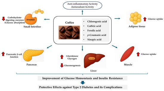 The degree of coffee roasting may also influence physiological effects. A study in diet-induced obese rats compared the metabolic effects of unroasted, dark, and very dark-roasted coffee []. All three coffee types improved glucose tolerance and significantly lowered insulin levels and resistance, indicating enhanced insulin sensitivity. Notably, dark-roasted coffee lowered fasting glucose levels. Among the three types of coffee, unroasted coffee had the most pronounced lipid-lowering effects, including reductions in triglycerides, free fatty acids, and adipocyte size, all of which are closely linked to insulin resistance. Regardless of the degree of roasting, coffee intake attenuated hepatic steatosis and decreased the markers of hepatic apoptosis, suggesting a protective effect against liver dysfunction which is often associated with insulin resistance and metabolic dysregulation in T2DM [].