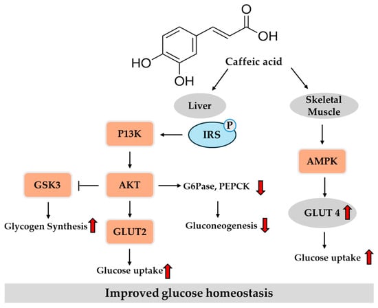 Potential pathways of caffeic acid in regulating glucose homeostasis in the liver and skeletal muscle. Red arrows indicate direction: ↑ increase, ↓ decrease. AMPK, adenosine monophosphate-activated protein kinase; GLUT, glucose transporter; GSK3, glycogen synthase kinase 3β; IRS, insulin receptor substrate; P, phospho; PI3K, phosphatidylinositol 3-kinase.