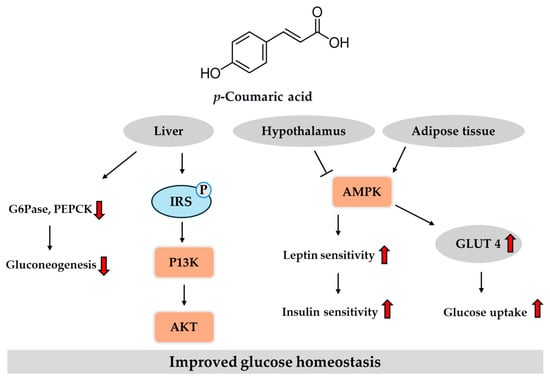 - Nguyen, L.V.; Nguyen, K.D.A.; Ma, C.T.; Nguyen, Q.T.; Nguyen, H.T.H.; Yang, D.J.; Tran, T.L.; Kim, K.W.; Doan, K.V. p-Coumaric acid enhances hypothalamic leptin signaling and glucose homeostasis in mice via differential effects on AMPK activation. Int. J. Mol. Sci. 2021, 22, 1431. [Google Scholar] [CrossRef]