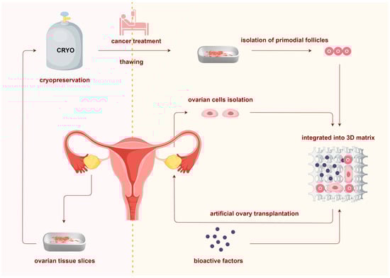 Bioprosthetic ovaries are designed to prevent cancer recurrence during the ovarian tissue cryopreservation and transplantation process. In practice, if patients are prepubertal or require immediate gonadotoxic therapy, ovarian tissue cryopreservation is the only fertility preservation approach [,]. Typically, ovarian tissue is surgically removed and cryopreserved through slow freezing before the initiation of gonadotoxic treatment []. It is also recommended that original tumor samples be cryopreserved alongside ovarian tissue for future cancer analysis [,]. After cancer treatment is completed, the first step in determining appropriate therapeutic options is a risk analysis of ovarian metastasis [,]. Many methods have been used to estimate the risk of ovarian metastasis, including identifying disease-specific markers in specimens by immunohistochemistry and grafting thawed tissue slices into severe combined immunodeficient mice, although no standardized practice exists to date [,]. If the risk of malignant cell transmission cannot be ignored, follicles can be isolated from thawed tissue and encapsulated in a matrix. To mimic the physical and biological characteristics of natural organs, such a matrix will also integrate additional ovarian cell populations and bioactive factors essential for folliculogenesis []. Finally, bioprosthetic ovaries are grafted to patients and are desirable to maintain follicle survival until replaced by a developed natural architecture. In conclusion, bioprosthetic ovaries generally include four interrelated components: isolated follicles, ovarian stromal cells, matrix, and bioactive factors. Figure 1 presents an overview of the bioprosthetic ovary construction process, from ovarian tissue cryopreservation to transplantation.