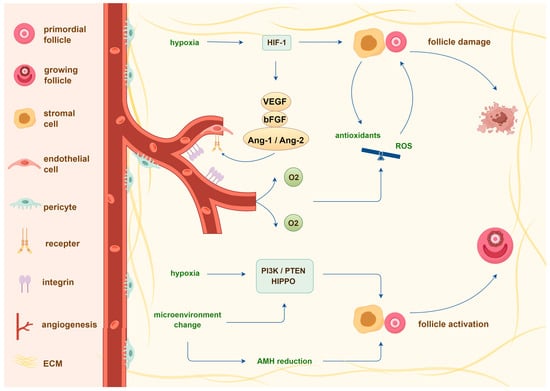 Beyond ischemia, primordial follicle loss is accompanied by a significant increase in larger follicles and granulosa cell proliferation, suggesting that premature recruitment and burnout of primordial follicles occur shortly after transplantation [,,]. Hypoxia and mechanical changes to the extracellular environment are thought to induce abnormal follicle growth through the activation of the HIPPO and PI3K/PTEN signaling pathways [,,,]. Additionally, this phenomenon might be attributed to the lack of inhibitory factors such as anti-Müllerian hormone (AMH), which are mainly produced by a growing follicle population to maintain the suppression of primordial follicles [,]. Compared to primordial follicles, developed follicles are more sensitive to hypoxia and mechanical injury during transplantation. Therefore, the loss of growing follicles might reduce AMH suppression, ultimately resulting in over-recruitment of primordial follicles in grafts [,]. Similarly, a previous study showed that the presence of the medulla in addition to the ovarian cortex promotes follicle survival in mouse xenografts, possibly because more developing follicles were preserved [,]. Figure 2 summarizes the mechanisms described in the paragraphs above.