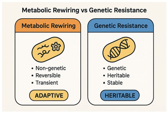 A comparative overview of the key features distinguishing metabolic rewiring from classical genetic resistance is provided in Table 2.