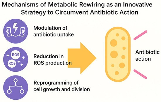 These mechanisms—the modulation of antibiotic uptake, the reduction in ROS production, and growth reprogramming—collectively define the functional basis of metabolic rewiring and its role in promoting bacterial tolerance (Figure 2).